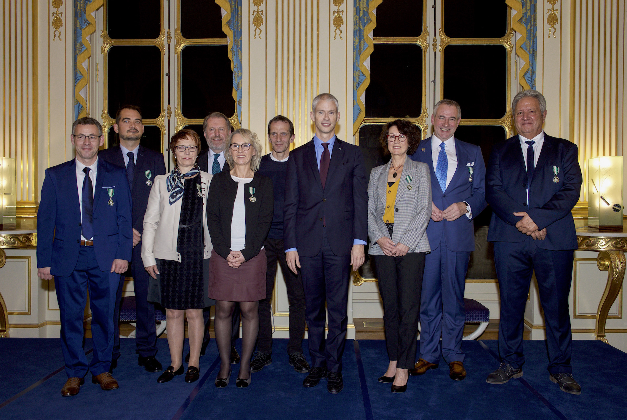 Comité Colbert. Remise des insignes de Chevalier dans l’ordre des Arts et des Lettres à huit artisans du luxe français par le ministres de la Culture.: Grégory Weinstock – Joaillier Van Cleef & Arpels; Yoann Viard – Cretat-Maître laqueur S.T. Dupont; Isabelle Lépy – Maroquinière Longchamp; Guillaume de Seynes – Président Comité Colbert (Hermès); Sylvie Romet – Dame de table Guerlain; Olivier Joannen – Tisseur à bras Pierre Frey; Franck Riester – Ministre de la Culture; Fabienne Suchot – Maroquinière Louis Vuitton; Eric Beaumard – Chef sommelier George V; Serge Vaneson – Tailleur-graveur Baccarat. Ministère de la Culture, Paris, le 8 novembre 2018. © Julio Piatti