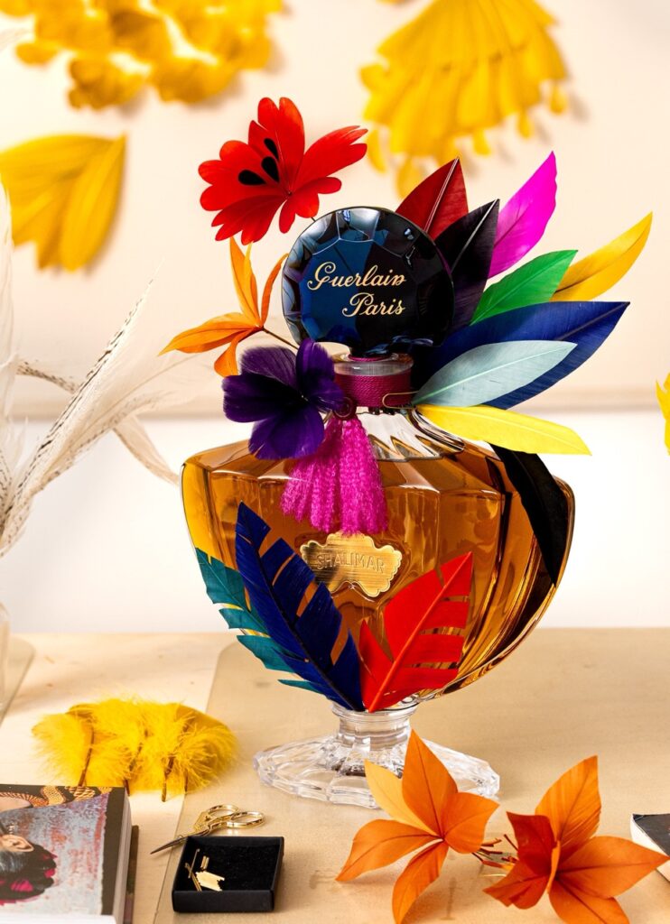 L’art est dans l’ADN de Shalimar. Son flacon est une sculpture, sa formule une partition, et son univers puise dans l’esthétique des Arts Décoratifs. À l’occasion de son centenaire, Guerlain a invité des artistes contemporains à dialoguer avec ce parfum mythique. Parmi eux, l’artiste franco-brésilienne Janaïna Milheiro a revisité le flacon en édition limitée, mêlant plume, broderie et textile, inspirée des jardins de Shalimar et de la flamboyance de Frida Kahlo. Nous avons également associé l’école des Gobelins en invitant des étudiants à explorer la richesse sensorielle et symbolique du parfum. Leurs créations, mêlant textures, lumières et matières, traduisent un équilibre entre héritage et modernité, jouant avec les codes historiques tout en les réinterprétant avec audace. Trois œuvres ont été sélectionnées et présentées dans l’exposition En Plein Cœur, montrant que Shalimar continue d’inspirer et d’éveiller l’imaginaire des artistes d’aujourd’hui.