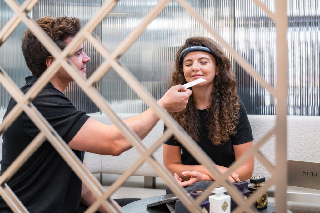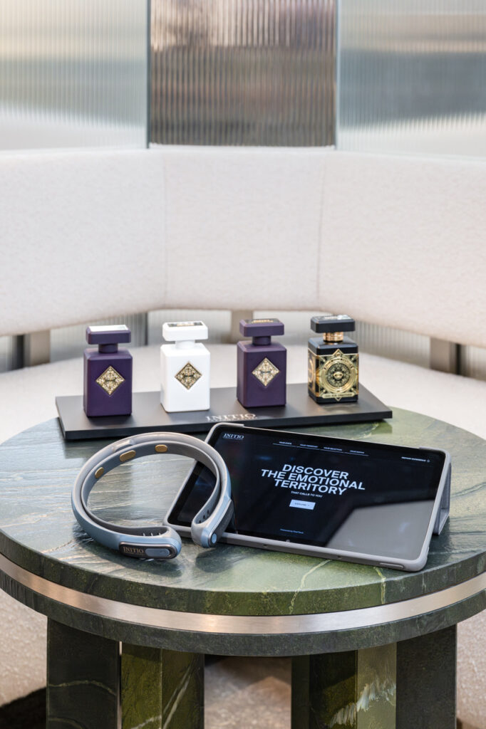 Initio pousse ses convictions jusqu’au bout. « Quand vous entrez dans la boutique Initio, au 320, rue Saint-Honoré, la première question que l’on vous pose est : Que voulez que votre parfum vous fasse vous ressentir ? Quel état d’esprit recherchez-vous ? » détaille Quentin Dubois. Sur demande, le client peut alors expérimenter un tout nouveau moyen de choisir son parfum. Un bandeau muni de capteurs est alors placé au niveau de son front afin d’enregistrer ses ondes cérébrales.